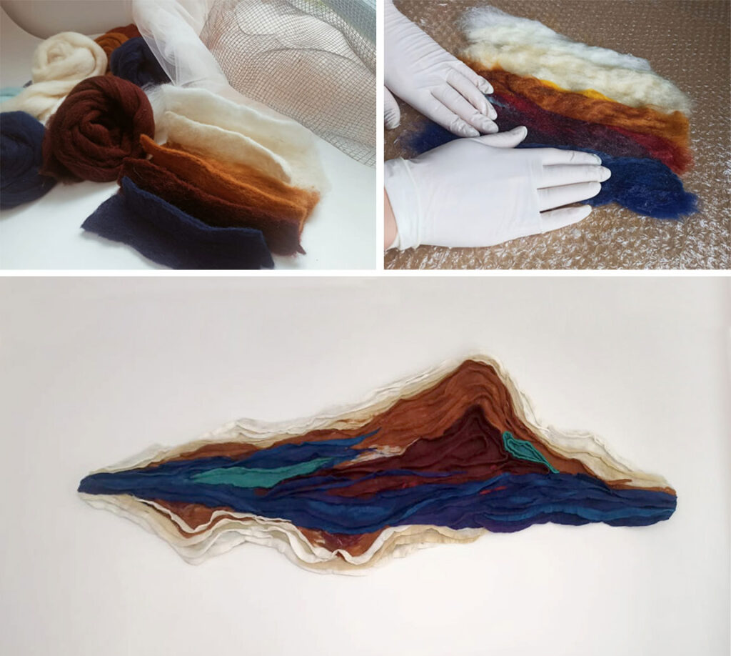 Keti Benashvili “Mountains” wire, merino wool, 140 x 380 x 15 cm. 2025