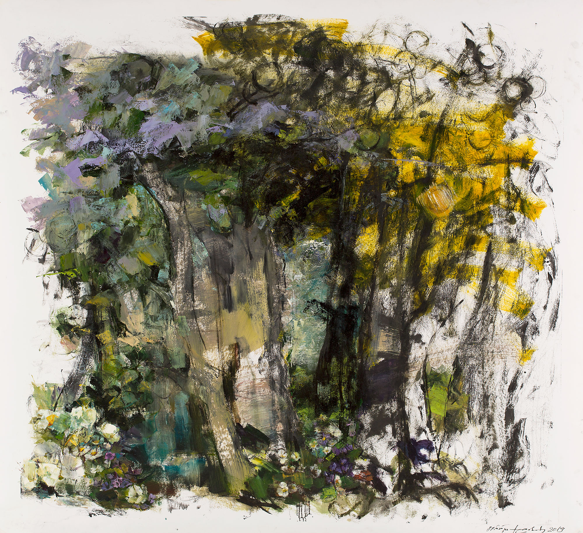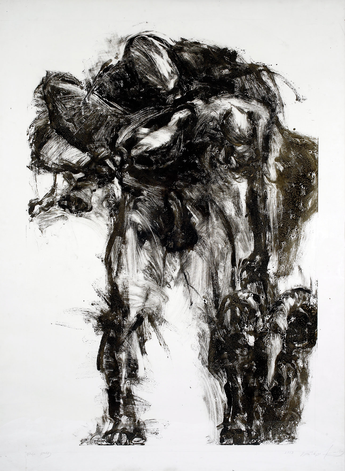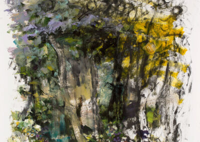 As a result of their extremely powerful energy, the objects in the paintings and creative field of Guranda Klibadze explode like mines. A painted flower opens and flourishes in front of our eyes; the trembling body of a horse exudes the excitement of a race; the intertwined figures of “Adam and Eve” and “Medea and Jason” demonstrate the fateful interlacing of the couples’ fates; astonished by Medea’s escape, Aeetes’ body burns like a torch. These are the great themes for which the artist selects large-scale pieces of paper and bold brush strokes, enamel textures of typographic paint, and complex monotype techniques. Her enchanting magical gardens remind us of the location of oracles, the places of mysteries; the figures are mythological characters, the actions – rituals. These are the eternal themes or related motifs that fill her works with eternal energies, and flow wherever the artist shares her existential secrets.