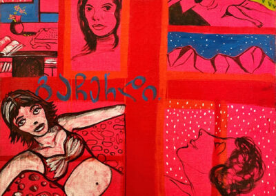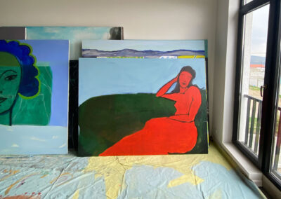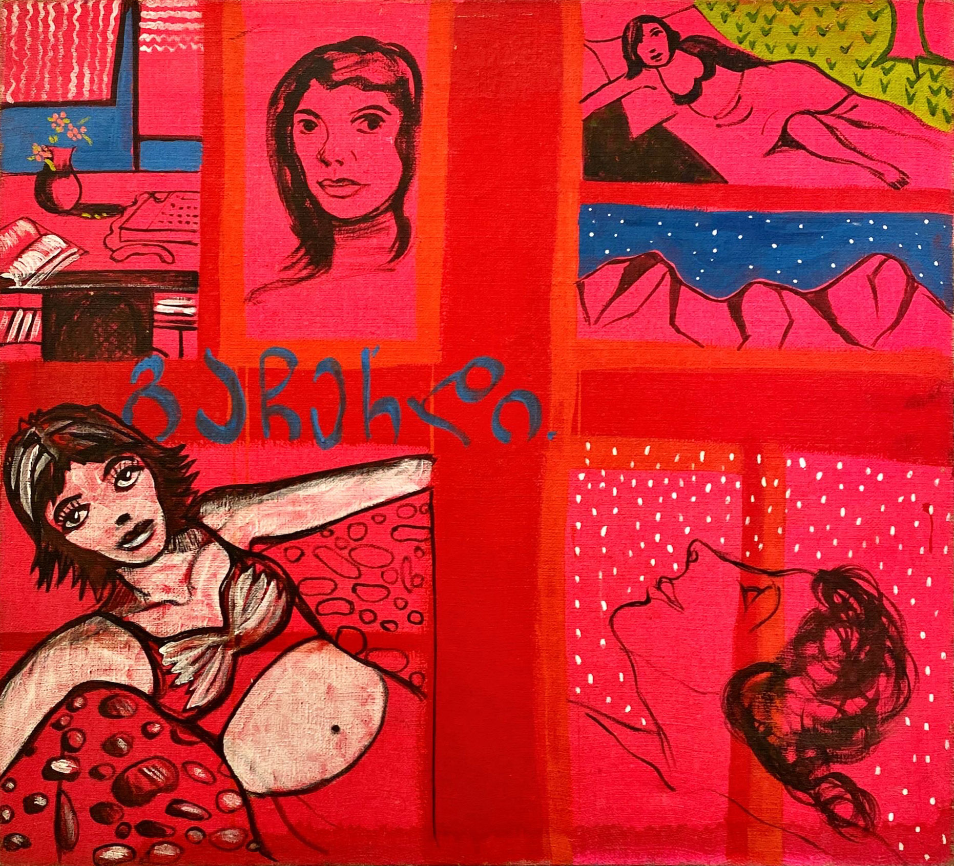 Lia Shvelidze enters the world of culture with an ancient narrative – the theme of woman who is shown as a feminine beginning, in the form of a deity or an idol in ancient civilizations. The artist offers modern interpretations of feminine energy, specified through the endless personification of a woman’s role. These dominant large-scale figurative images demonstrate gender-based artistic constructions with their conditional backgrounds and hinted entourage, the accompanying texts, active colored spots, and the clear outline of the drawings. In fact, this is the image of eternal Eve, who continues her cultural existence in many shades, and whose captivating versions are offered by Lia Shvelidze.