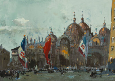 The main thread of Mamuka Tsetskhladze’s work was created in the post-Soviet era. It is astonishing that during such a difficult period, it still tells the story of the beauty of the world – describing its natural or created brilliance and the happiness of “being”. In this way his script and its existential narrative turn into an “anthem” of culture. The artist acts within the framework of the aesthetic and humanistic values that are manifested in the cultural categories of the world and accord life splendor and light. With this position, the artist introduces the idea of overcoming crisis through culture. He is an artist and culturologist who studies and paints the oases, icons and signs of universal culture: views of Paris with its squares, railway stations and bridges, Rome and Venice, Istanbul, the Samarkand mosques, the iridescent nights of Mumbai, landscapes of Tbilisi, the sky-blue beaches of Batumi and the Seychelles. He is interested in eternity captured in seconds: the illusory effect of simultaneous permanence and transience. The artist selects the specific atmosphere, lighting and weather effect, as well as color gradation for each work in order to create an unusual image from ordinary events and produce a celebration and a show. He is interested in cities and countries as the objects of civilization – the material systems of culture, whose aesthetic resources are designed to last an eternity.