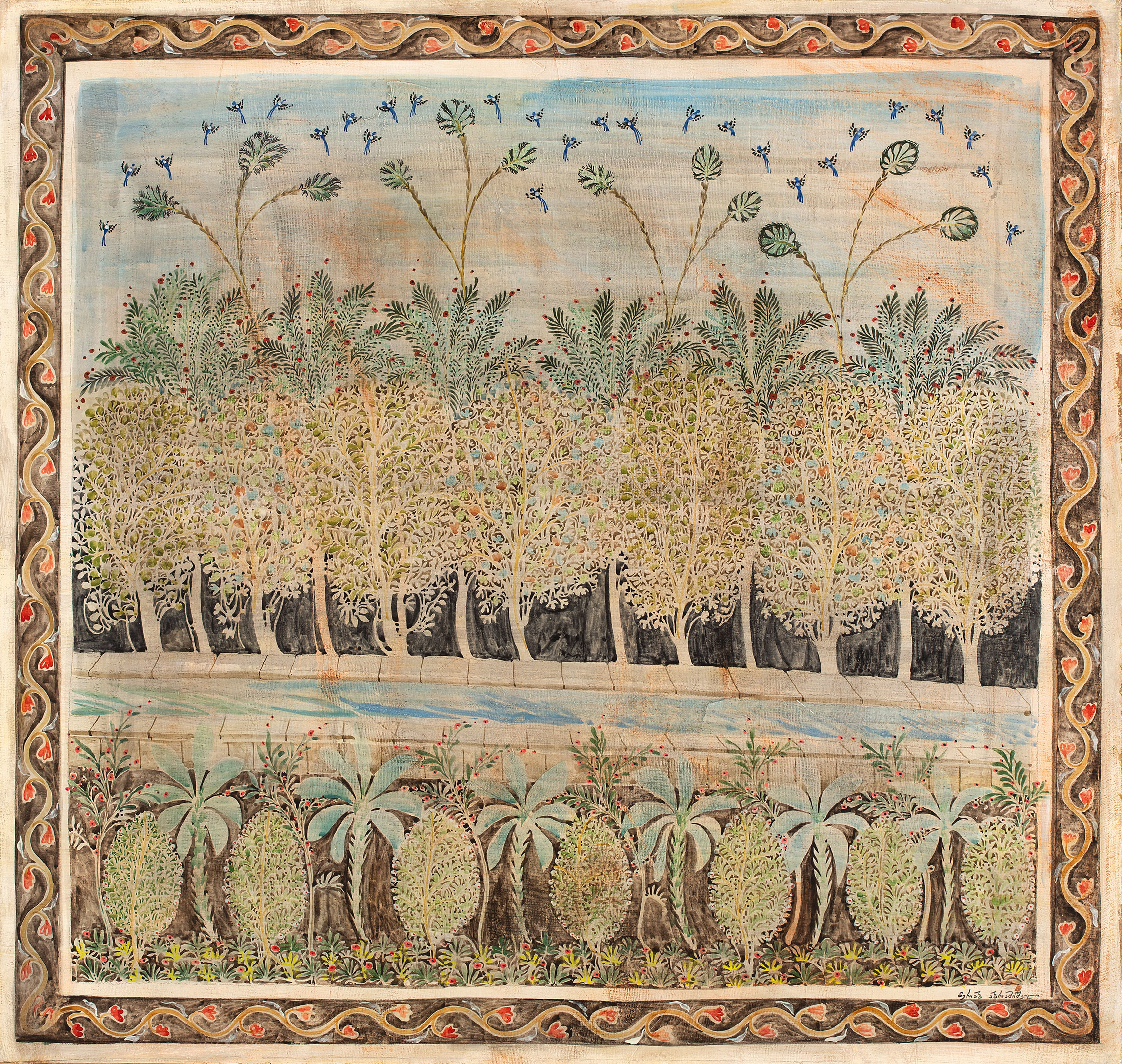 The cosmogonic model of Merab Abramishvili’s work deals with the theme of paradise: namely, the archetype of the Garden of Eden, the joy of “being” inside it, and perilous external adventures.